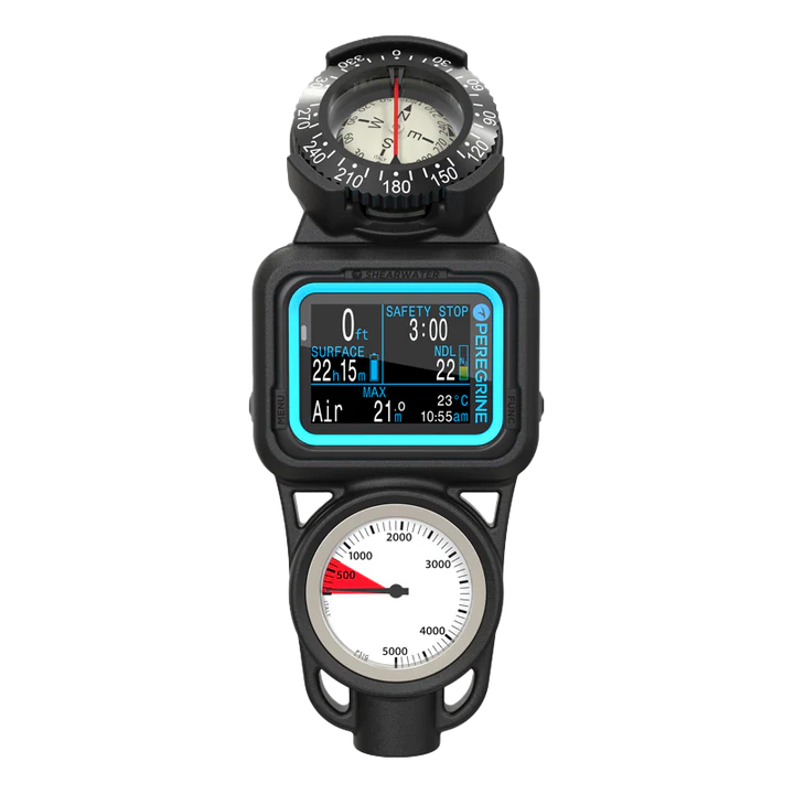 A fully assembled console incorporating the Shearwater Peregrine dive computer, SPG, and compass in one component.
