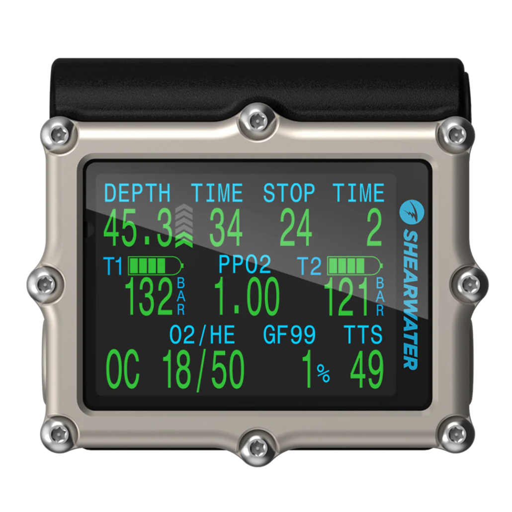 Air integration is standard with up to four Shearwater transmitters to customize a solution from open circuit to rebreather and bailout gas pressure monitoring.