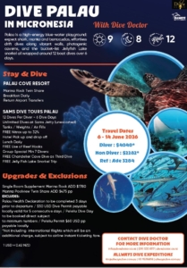Palau 7 nights at the Palau Cove resort and 6 days diving with Sam’s Tours June 6th – 14th